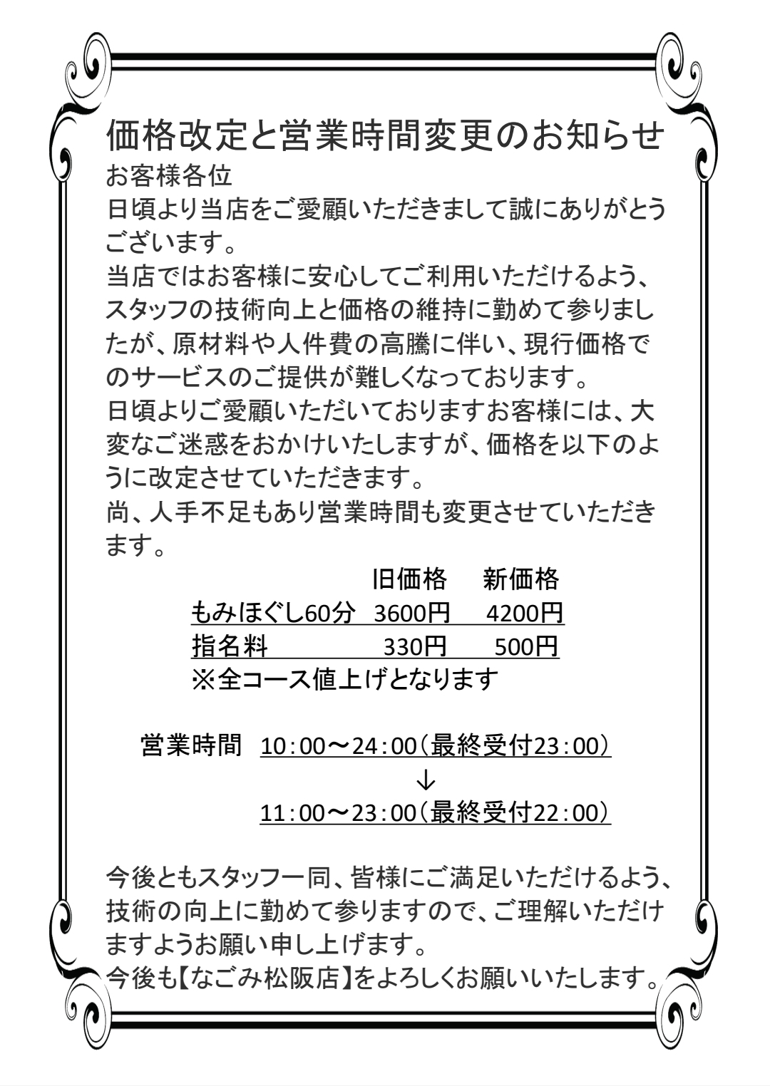 株式会社AH > お知らせ > なごみ > 価格改定と営業時間変更『なごみ松阪店』